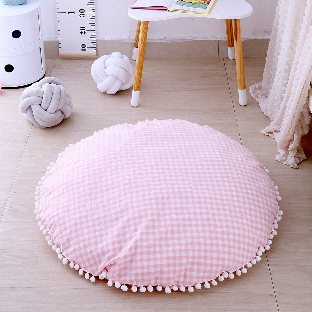 Brighten your nursery with the Fituraa Pink Gingham Baby Play Mat, a delightful blend of style, comfort, and practicality. Measuring 95cm in diameter, this generously sized round mat provides a soft, cushioned surface perfect for tummy time, crawling, reading, or playful moments. The cheerful pink-and-white gingham pattern adds a sweet, timeless charm, while the whimsical pom-pom trim gives it a playful finishing touch.